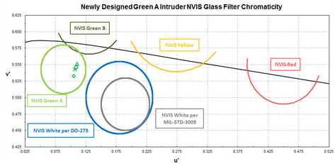 The NVIS application requires that cockpit lighting radiation be minimized and our new filters continue to exceed military standards with a low radiance output. Chromaticity values meet the military and civilian standard requirements when using specified white LEDs with a correlated color temperature (CCT) range of approx. 4000-5500K.